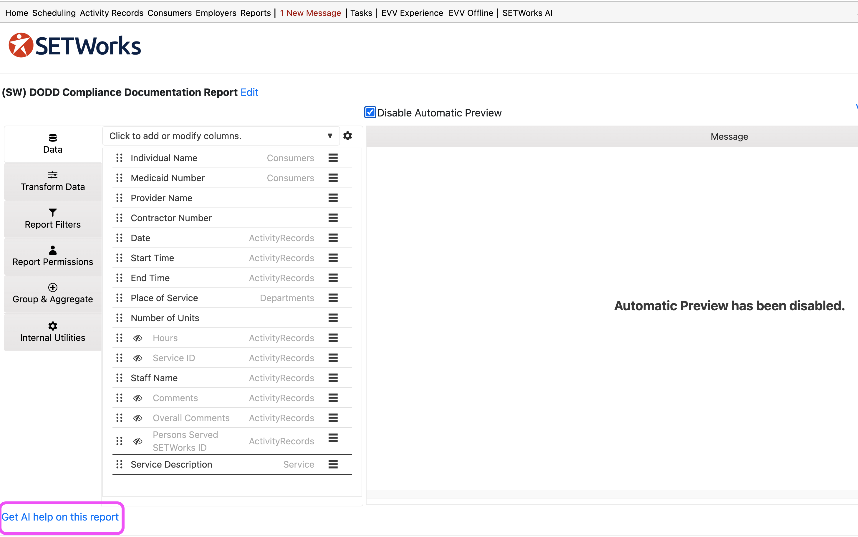 If you have SETWorks AI Enhanced - click "Get AI help on this report" at the bottom of your screen to access the Report Builder Assistant.