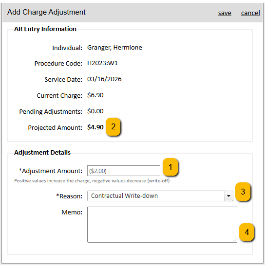 Once the Charge Adjustment window loads, you can input an adjustment amount (1). Positive values will increase the charge, and negative values will decrease the charge. The projected amount (2) will show what the net charge will be after the adjustment is applied. The "Reason" dropdown (3) can be configured in the "Charge Adjustment Reason" utility (Settings > Provider Build tab > Utilities dropdown > Charge Adjustment Reason utility) and an optional memo can be added (4):