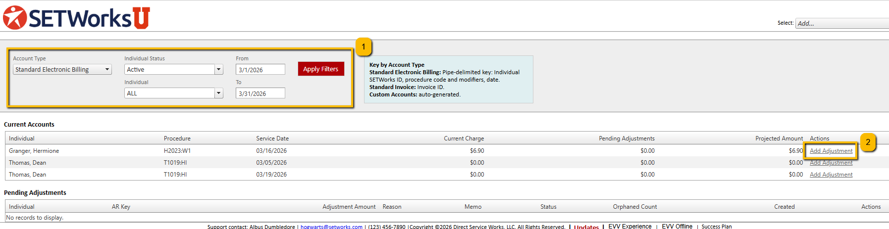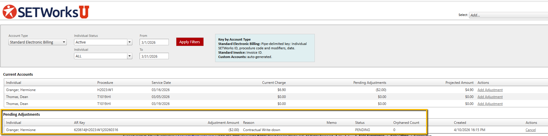 Charge adjustments will be listed in the "Pending Adjustments" grid until the current accounting period is closed. When the accounting service is applying payments to accounts, it will also apply charge adjustments, at which point the adjustments are no longer considered "pending" and will leave the "Pending Adjustments" grid.