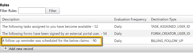 To the Rules grid, you can add rule 90 - "A follow-up reminder was scheduled for the below claims:"