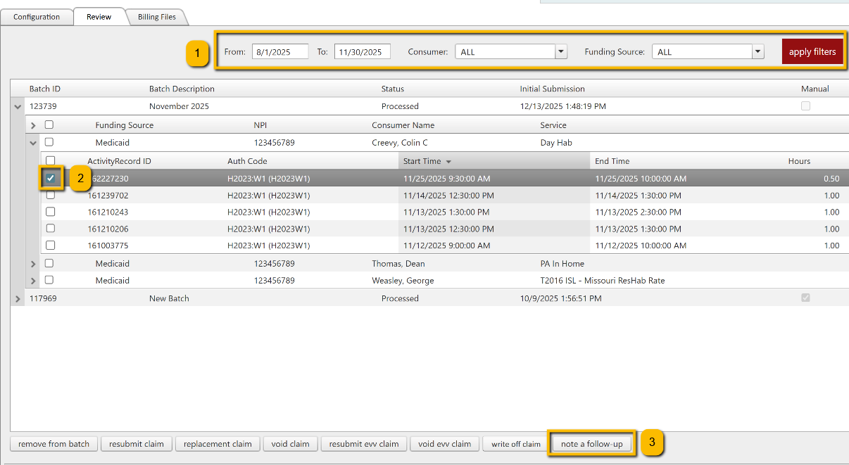 Adjust the filters to show the activity records you would like to create a follow up note for (1). Select the checkboxes for records you want to apply the note to (2), and click "note a follow-up" (3).