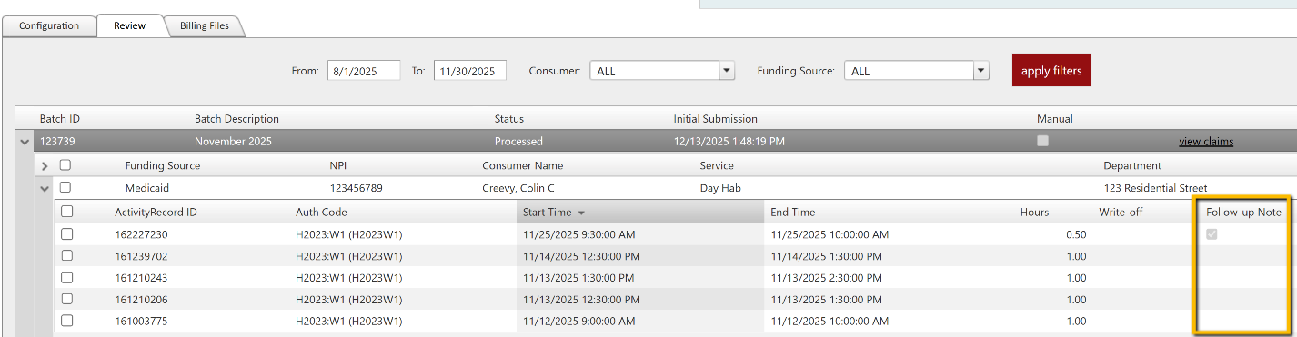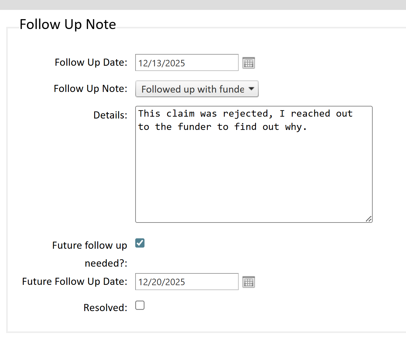 When claims get partially paid or denied and need follow up, or when you want to documentation around billing corrections, use the Claim Follow Up Notes feature to track your progress and follow-ups with funders.