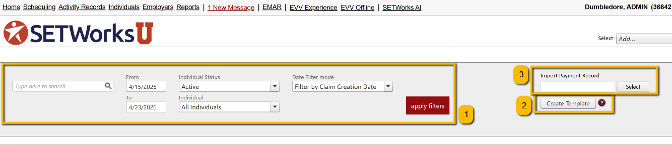 Adjust the filters to show the claims you would like to apply a manual payment to (1). Then click on "Create Template" (2). This will generate an excel template with your claims where you can input the payment information. When the template is filled out, upload by clicking on "Select" (3):