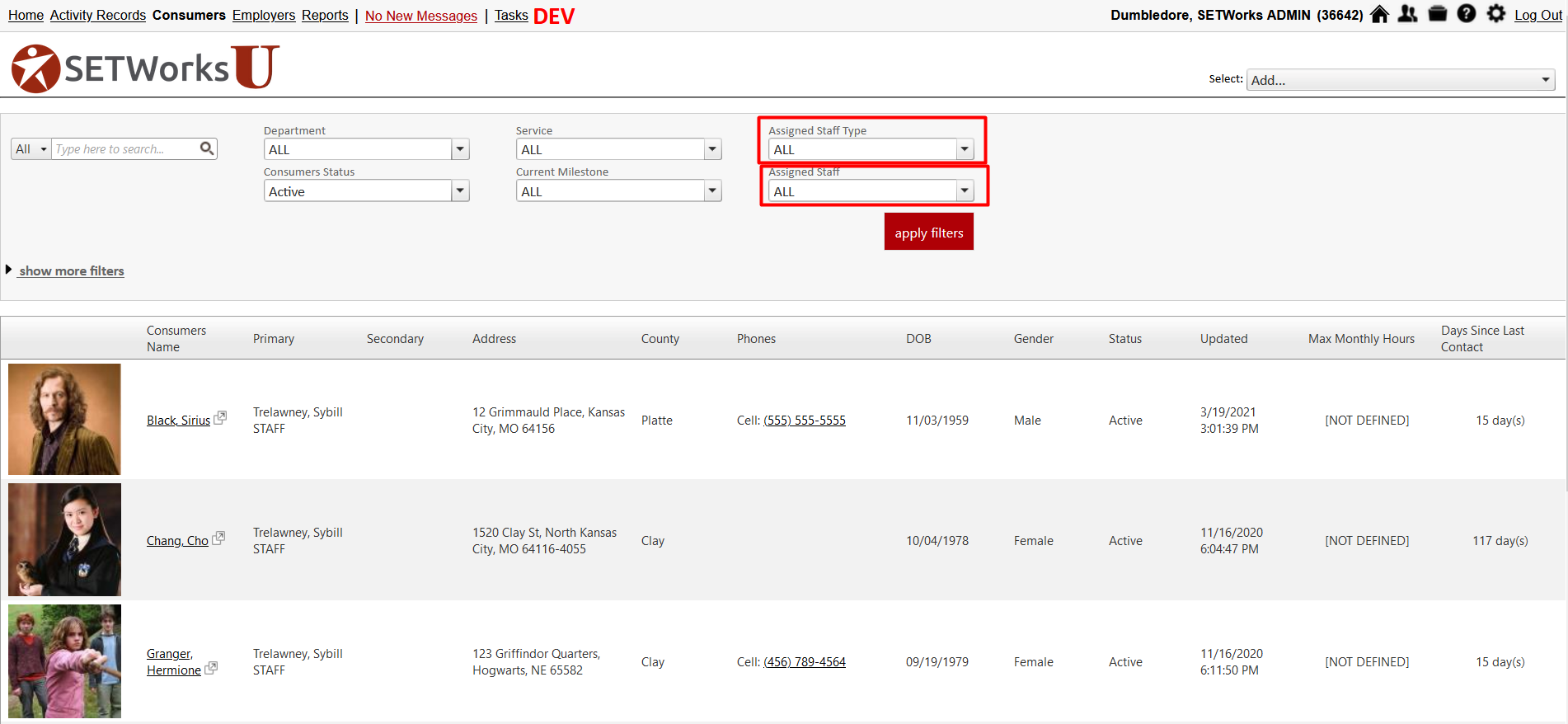 If you notice the Assigned Staff Type or Assigned Staff filters default when accessing the Consumer index, these are settings applied within the privileges in SETWorks.