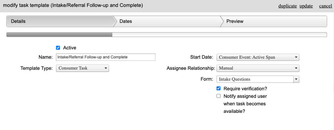 Tasks can be used to streamline the intake/referral process and ensure nothing slips through the cracks. Below is an example of a Task that can be added to a Staff for an Individual to complete their intake within 20 days. A form with additional questions is attached to the task so the task and the form can both be completed at the same time.