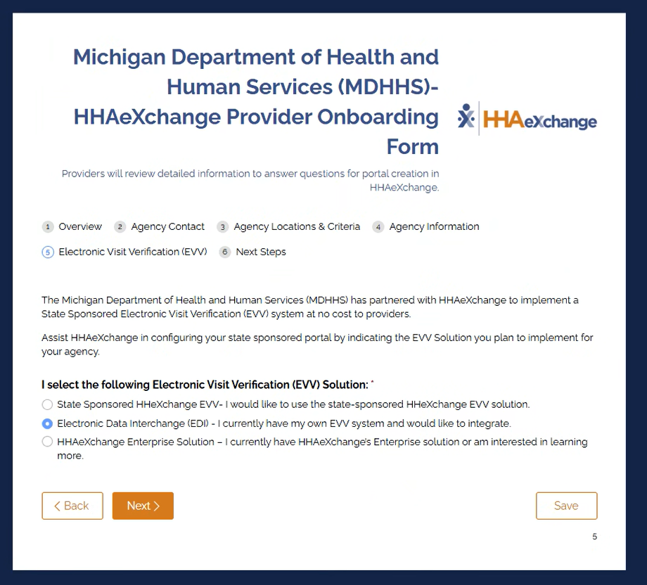 When registering with the state please select Electronic Data Interchange (EDI) to indicate that you'll be using SETWorks to collect and submit EVV data.